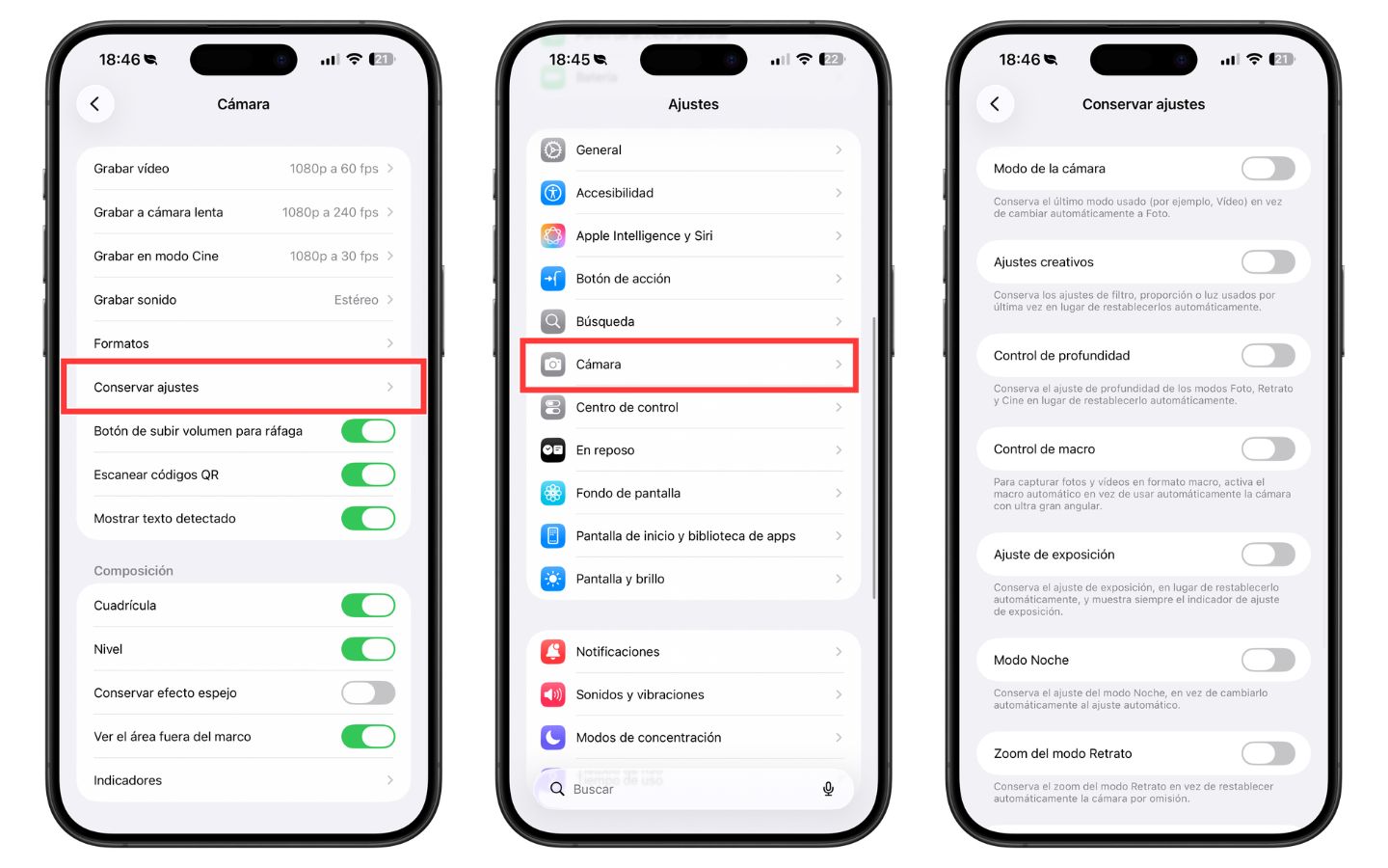 Para acceder a estas opciones, no busques dentro de la propia app de Cámara; tienes que ir a los ajustes del sistema. Ves a: Ajustes > Cámara > Conservar ajustes.